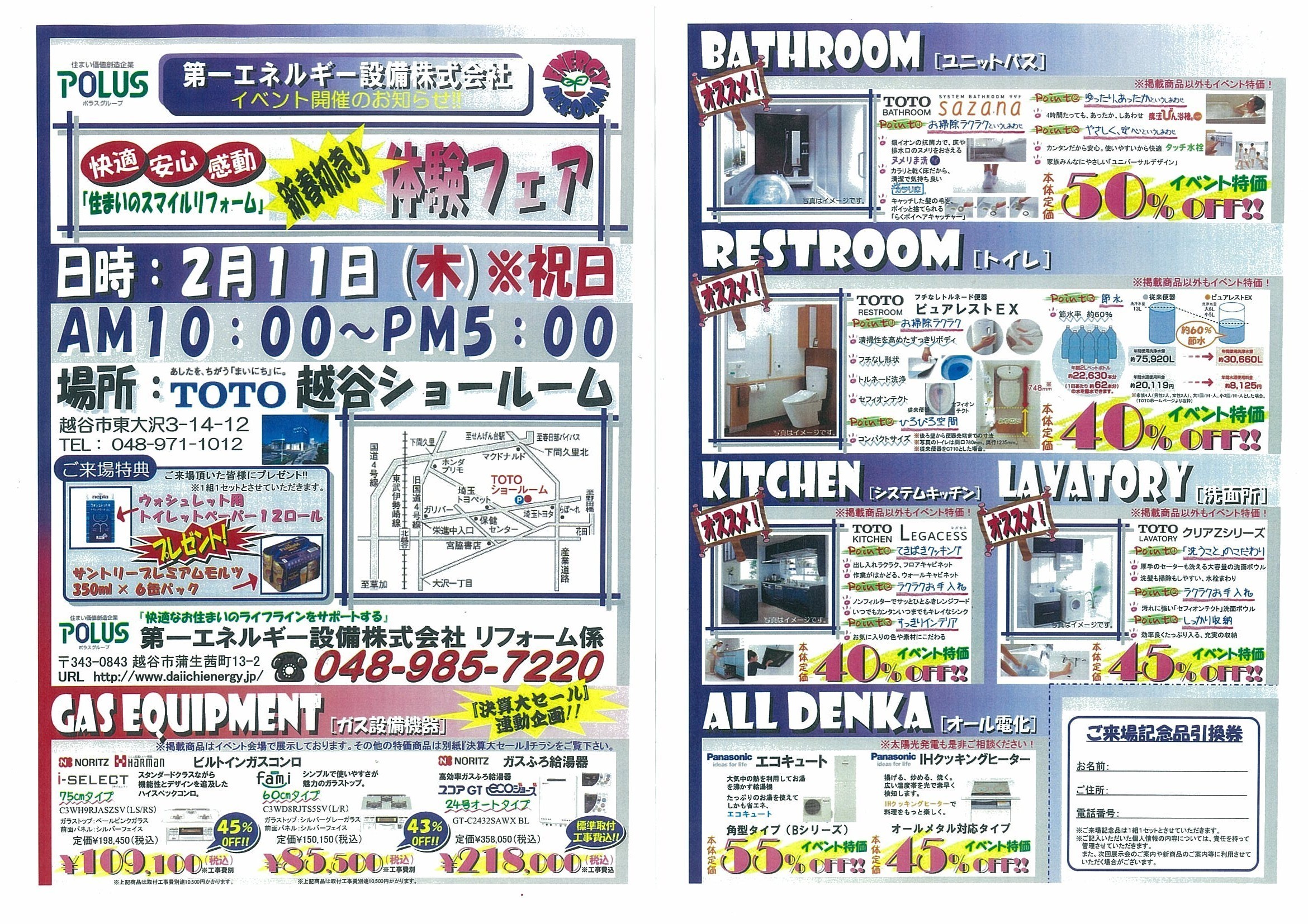 日頃の感謝をこめて、新春初売り体験フェア行います♪ 日時:2月11日(木)祝日 AM10:00~PM5:00 場所:TOTO越谷ショールーム 埼玉県越谷市大沢3-14-12 ※添付チラシの地図をご参照ください。 ①決算大セール連動企画!お買い得品が盛だくさん♪ ②ご来場記念特典として、サントリープレミアムモルツ350ml×6缶とトイレットペーパー12ロールをプレゼント! ※添付のご来場記念品引換券をお持ちになってご来場下さい。 ③キッチン、バス、洗面台なども展示☆ オール電化をご検討の方もお気軽にご相談ください。 皆様のお越しを社員一同心よりお待ちしています。 |