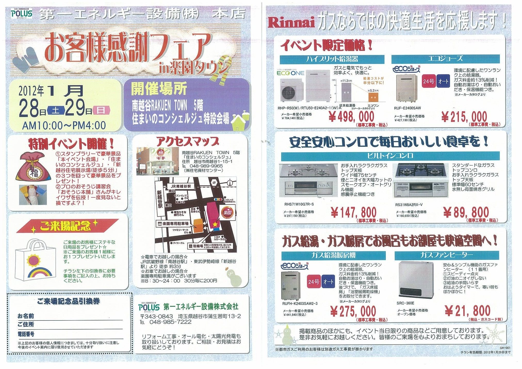 1月28日(土)29日(日)に 南越谷楽園タウン5Fにて、イベントを行います。 ガス器具をイベント限定価格にて販売。 又、ご来場のお客様にステキな日用品をプレゼントいたします。 <特別イベント> ①スタンプラリーで豪華景品 「本イベント会場」・「住まいのコンシェルジュ」・「新越谷住宅展示場(徒歩5分)」の3つを回って豪華景品をプレゼント! ②プロのおそうじ講習会 「おそうじ本舗」さんがキレイワザを伝授!一度見ないと損ですよ?! 是非お気軽にお越しください。皆様のご来場を心よりおまちしております。 |