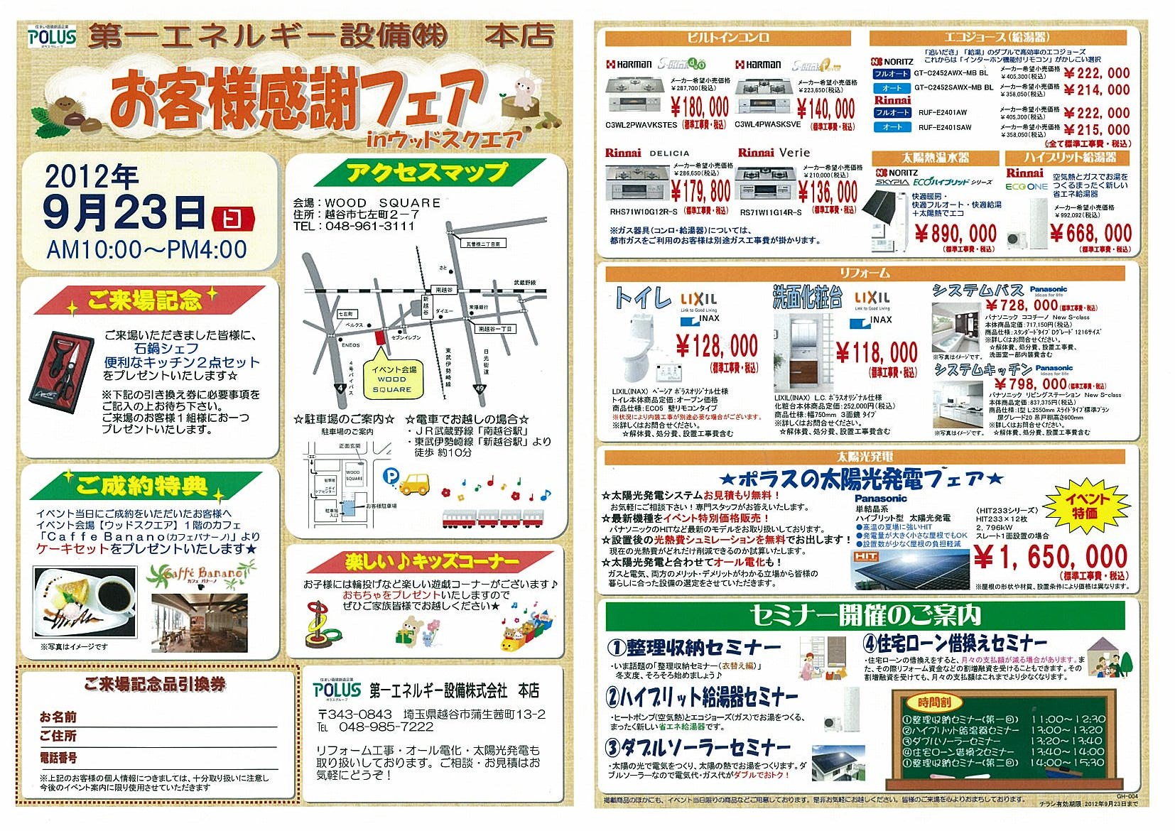 日頃より、第一エネルギー設備にご協力賜りましてありがとうございます。 お得な商品、納得情報がいっぱい。 どうぞお誘いあわせのうえ、ご来場ください。お待ちしております。 日時:平成24年9月23(日) 10:00~16:00 場所:ウッドスクエア 特設会場 内容: 1)ガス機器展示&特価販売 2)リフォーム商品特価販売(トイレ、洗面化粧台、システムバス、システムキッチン) 3)太陽光発電特価販売 4)ハイブリット給湯器セミナー(展示販売、セミナー) 5)ダブルソーラーセミナー 6)住宅ローン借換えセミナー 7)整理収納セミナー 8)来場記念品(石鍋シェフ 便利なキッチン2点セット) 9)ご成約特典(「Caffe Banano(カフェ バナーノ)」ケーキセット) |